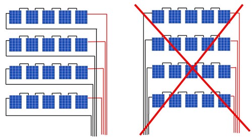 Es fácil entender que no debemos cambiar la forma de agrupar los conductores de un mismo circuito sólo por el hecho de no haber inconvenientes dado que siempre ayudará más a la identificación agrupar un polo positivo con su correspondiente negativo. Pero es importante saber y razonar sobre el porqué podemos y debemos agrupar cables de la misma polaridad en tendidos para instalaciones fotovoltaicas.