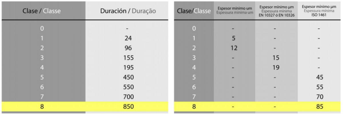 Por ejemplo el Galvanizado en Caliente, uno de los acabados a base de zinc más frecuentes para ambientes húmedos o instalaciones en el exterior, se clasificaría según el espesor en micras del recubrimiento de zinc desde la C5, la más habitual, hasta la C8, sólo para casos muy concretos.