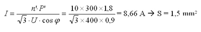 Aplicamos la fórmula para redes trifásicas, teniendo en cuenta el coeficiente 1,8, en ausencia de datos más precisos del fabricante, por el que debemos multiplicar la potencia de cada receptor por ser lámparas de descarga (ITC-BT 44, pto. 3.1, 4º párrafo):