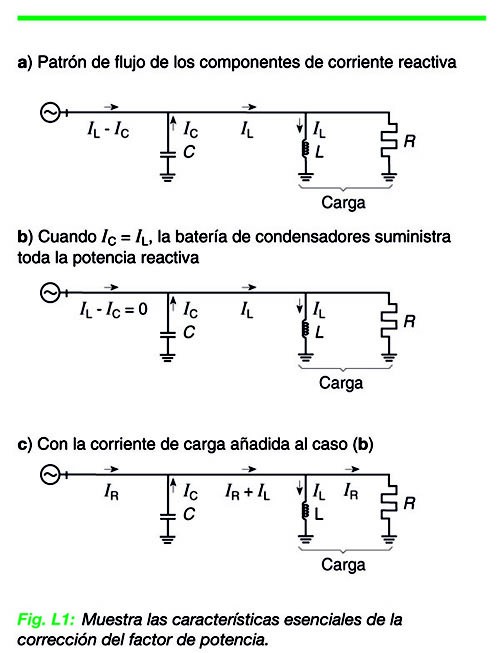 Se observa en el diagrama (b) de la Figura L1 que la batería de condensadores C aparece como suministradora de toda la corriente reactiva de la carga. En el diagrama (c) de la Figura L1, se ha añadido el componente de corriente de potencia activa y se indica que la carga (totalmente compensada) tiene en el sistema de alimentación un factor de potencia de 1.