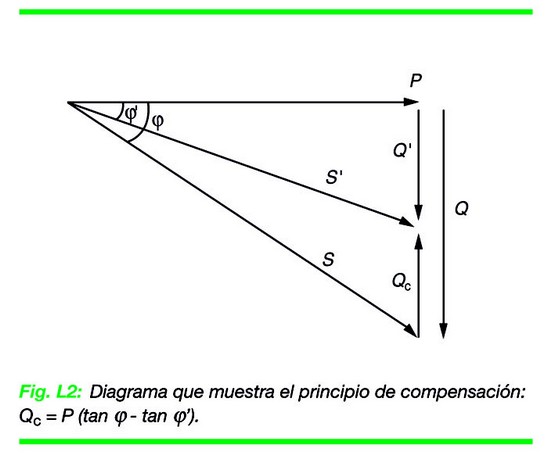 La Figura L2 utiliza el diagrama de potencia tratado anteriormente para ilustrar el principio de compensación al reducir una potencia reactiva Q a un valor más pequeño Q' mediante una batería de condensadores que tiene una potencia reactiva Qc. Con esto, se observa que la magnitud de la potencia aparente S se reduce a S'.