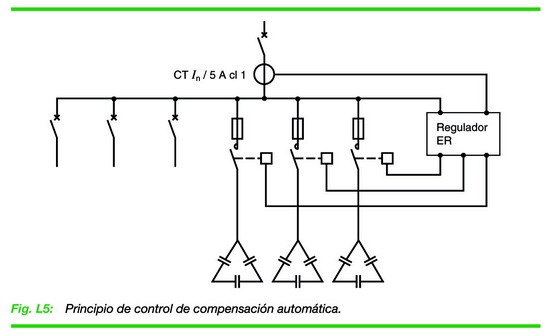 Si se añade a la carga una batería de condensadores, su corriente reactiva (capacitiva) recorrerá la misma trayectoria a través del sistema de alimentación que la de la corriente reactiva de carga. Como esta corriente capacitiva IC (que desfasa la tensión 90 grados) está en oposición de fase directa a la corriente reactiva de carga (IL), los dos componentes que fluyen a través de la misma trayectoria se anularán mutuamente, de tal forma que si la batería de condensadores es suficientemente grande e IC = IL, no habrá flujo de corriente reactiva en el sistema aguas arriba de los condensadores.