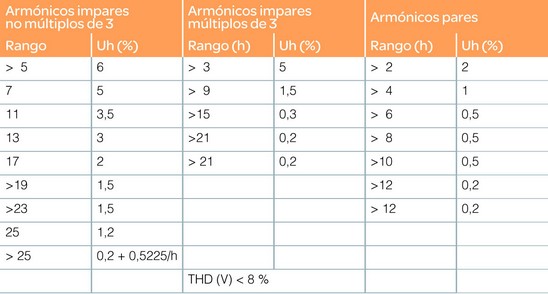 La tasa total de distorsión armónica en tensión tiene un valor de THD (V) < 8 %. Por lo tanto, todos los aparatos deberán poder soportar este valor y, al mismo tiempo, será el máximo valor que todos los receptores podrán contaminar.