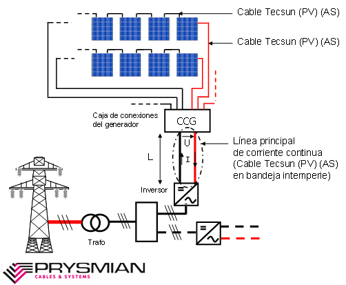Calculamos por el criterio de la caída de tensión una línea principal de corriente continua de una instalación solar como la de la figura: