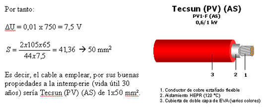 Resulta evidente que utilizar 56 m/(Ω/mm²) para la conductividad del cobre es una hipótesis errónea. Este valor es para 20 ºC, si partimos de una instalación en un ambiente que puede ser aproximadamente de hasta 50 ºC y además el conductor se va a calentar por efecto Joule al transportar la corriente, la temperatura del conductor va a ser superior a 50 ºC y como mucho de 90 ºC (en el caso del cable Tecsun (PV) (AS) puede llegar hasta a ser de 120 ºC por su diseño especial).