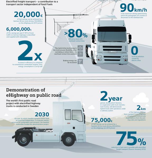 El ingeniero jefe del Departamento de Movilidad de Siemens, Roland Edel, afirma que "la eHighway es dos veces más eficiente que los motores convencionales de combustión interna. Nuestra innovación consiste en alimentar a los camiones con la energía que viene de las líneas eléctricas ". El sistema tiene una eficiencia del 80% y, además, cada vez que el conductor frena alimenta la red eléctrica con la energía cinética que se libera.