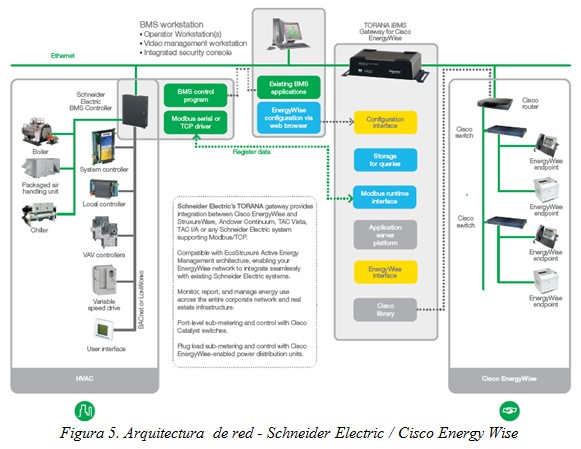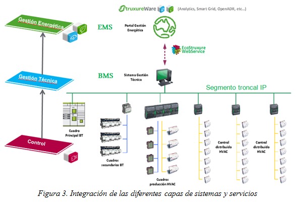 Por encima de esta capa de automatización, existe otra capa de información a nivel de gestión energética, constituida por el EMS, o sistema de gestión de la energía, que se focaliza en facilitar la adquisición, procesado y análisis de fuentes de datos con el objetivo de cuantificar los parámetros energéticos como, por ejemplo, la distribución de consumos, las emisiones de gas de efecto invernadero o los costes energéticos. El sistema relaciona estos datos con los procesos diarios propios de cada cliente así como con indicadores ambientales para facilitar la toma de decisiones a nivel energético y control técnico. El sistema, además, permite múltiples niveles y tipos de usuarios en la organización –incluyendo finanzas, gestión, operaciones, mantenimiento o ingeniería– para facilitar la información y análisis en el formato adecuado. Schneider Electric cuenta con la suite de software StruxureWare, que comprende varios sistemas de gestión energética como Energy Operation o Power Monitoring Expert, que permiten desarrollar las funciones anteriores.