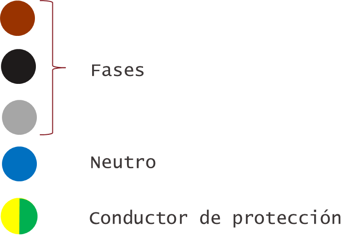 Los conductores de la instalación deben ser fácilmente identificables, especialmente por lo que respecta al conductor neutro y al conductor de protección. Esta identificación se realizará por los colores que presenten sus aislamientos. Cuando exista conductor neutro en la instalación o se prevea para un conductor de fase su pase posterior a conductor neutro, se identificarán éstos por el color azul claro. Al conductor de protección se le identificará por el color verde-amarillo. Todos los conductores de fase, o en su caso, aquellos para los que no se prevea su pase posterior a neutro, se identificarán por los colores marrón o negro. Cuando se considere necesario identificar tres fases diferentes, se utilizará también el color gris.