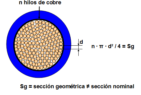Por otro lado decir que tampoco podemos conocer la sección del conductor geométricamente midiendo su diámetro exterior si es de hilo único o el diámetro de cada uno de los hilos pues según indica la norma UNE EN 60228 la sección del conductor no está sujeta a medida directa. La sección no es geométrica sino eléctrica correspondiente un valor máximo de resistencia eléctrica a cada sección de conductor según figura en la citada norma UNE EN 60228.