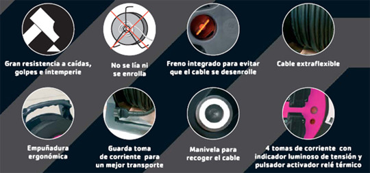 Aplicaciones: Enrollador ergonómico de cable Flextreme (H07RN-F) de tensión asignada 450/750 V, con cubierta de policloropreno, según UNE 21.027-4 y apto para servicios móviles. Adecuado para utilización en obras, emplazamientos interiores o exteriores en general, locales industriales, locales secos, húmedos o mojados, a la intemperie, en talleres de atmósfera explosiva, etc. (UNE 21176). Cumple las exigencias del RBT para provisionales de obras (ITC-BT 33), ferias y stands (ITC-BT 34), establecimientos agrícolas y hortícolas (ITC-BT 35), caravanas y parques de caravanas (ITC-BT 41) y puertos y marinas para barcos de recreo (ITC-BT 42). Soporta condiciones severas propias de emplazamientos industriales o de la intemperie: golpes, rozamientos, rayos UVA, frío, calor, grasas, aceites, hidrocarburos, humedad, agua… |