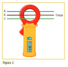 Compruebe los circuitos trifásicos rodeando con la pinza todos los conductores trifásicos. Si el neutro está disponible, la pinza debe abrazarlo también junto con el resto de los conductores de fase. El valor medido reflejará cualquier corriente que fluya a tierra. (Véase la figura 2)