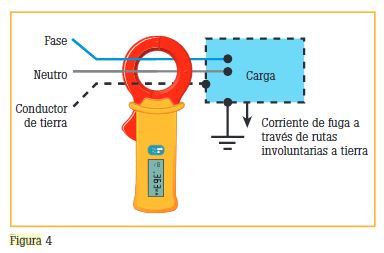 Si se abrazan juntos fase/neutro/tierra, se podrá identificar la corriente de fuga en la toma o en el cuadro eléctrico a través de rutas a tierra involuntarias (como por ejemplo en un cuadro eléctrico metálico asentado sobre una base de hormigón). Si existen otras conexiones eléctricas a tierra (como una conexión a una tubería de agua), se puede detectar corrientes similares. (Véase la figura 4)