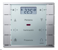 El pulsador multifunción con termostato de Merten sirve para controlar la iluminación, las escenas luminosas, las persianas y la calefacción. Asimismo, gracias a su termostato integrado, permite calentar o enfriar individualmente salas de manera cómoda y según las necesidades, gracias a un control temporizador. Todas las funciones del display se activan fácilmente. El pulsador multifunción con termostato se puede adquirir con receptor de infrarrojos, para poderlo activar cómodamente con un mando a distancia y con un vibrador que alerta de los posibles fallos y averías. Simplemente flexibilidad cinco estrellas.