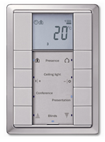 La cómoda unidad de mando de Merten puede efectuar todos los ajustes en la sala pulsando sólo una tecla o bien activar por separado cada función mediante una tecla o el display.
