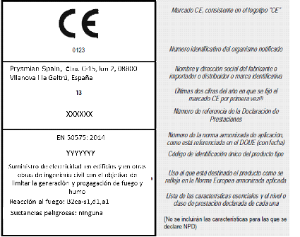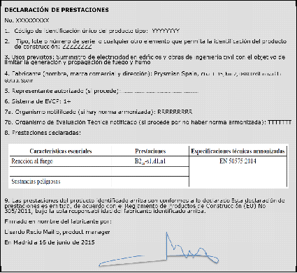 Por tanto, una vez definida la euroclase de reacción al fuego del cable, el fabricante puede redactar la Declaración de Prestaciones que deberá tener a disposición del cliente antes de introducir el producto en el mercado. Su contenido se ejemplifica a continuación: