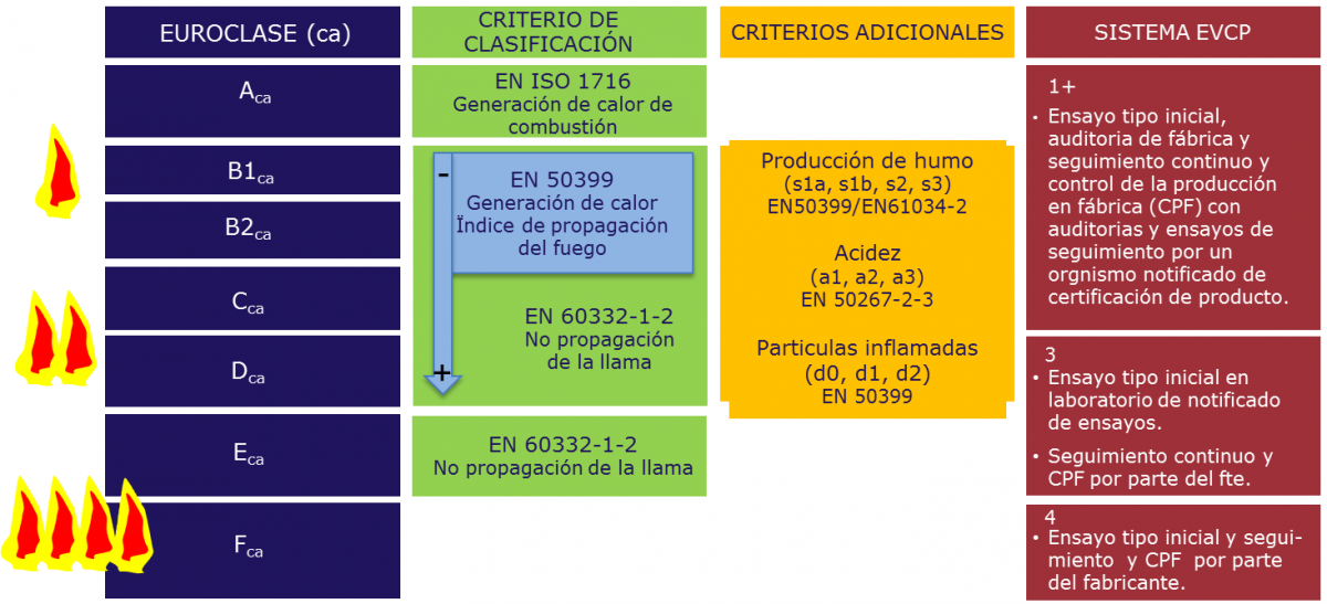 La norma UNE-EN 50575 recoge y asigna los ensayos de fuego citados en esta tabla para cada euroclase. EVCP = Evaluación y Verificación de la constancia de la prestación.