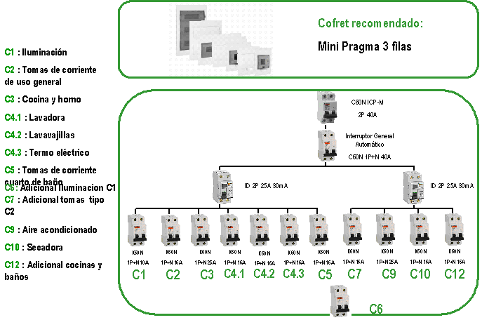 La protección magnetotérmica admite como dispositivos de protección contra sobrecargas y cortocircuitos únicamente los interruptores automáticos de Corte Omnipolar. En cuanto a Protección Diferencial, se instalará un mínimo de un interruptor diferencial por cada 5 circuitos, de modo que se garantice que todos los circuitos queden protegidos frente a intensidades diferenciales residuales de 30 mA.