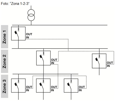 La selectividad de zona se realiza mediante un simple cable de conexión: cada una de las protecciones que detecta el fallo envía una señal de bloqueo (ZSout) a la protección aguas arriba y, antes de disparar, comprueba de no haber recibido una señal similar desde una protección aguas abajo. La salida ZSout puede conectarse a un máximo de 20 entradas ZSin en el lado de la alimentación en la cadena de selectividad.