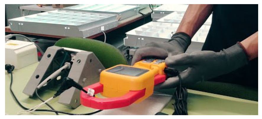 Medida de la corriente de arranque de un conjunto de seis pantallas de 60x60 con cuatro tubos LED 10W en cada una, se emplea una Pinza amperimétrica para medida de calidad eléctrica.