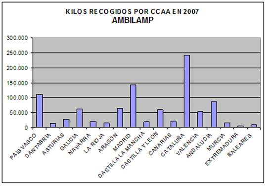 De este modo, Ambilamp ha recuperado ya 1.500 Toneladas de lámparas desde el inicio de su actividad hasta finales del 2007, destacando por Comunidades Autónomas, Cataluña, Madrid y País Vasco que han registrado las mayores tasas de reciclaje, alcanzando entre las tres el 50% del total de lo reciclado en España. Un segundo grupo compuesto por Andalucía, Galicia, Aragón y Castilla-La Mancha suman el 28%, y el resto de Comunidades el restante 22 por ciento.