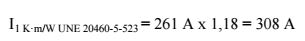 En la tabla A.1 de la norma UNE 211435 encontramos que el cable que nos ocupa (Al Voltalene Flamex 1x240 mm2) soportaría 340 A. Si bien es para terrenos de resistividad térmica 1,5 K·m/W. Tomamos el factor de conversión de la tabla A.6 que curiosamente es también 1,18, para pasar de 1,5 K·m/W a 1 K·m/W (según UNE 211435). Es el mismo coeficiente que para pasar de 2,5 K·m/W a 1 K·m/W según la UNE 20460-5-523.
