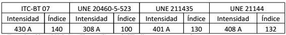 430 A/308 A = 1,4 ¡la intensidad admisible en las mismas condiciones es un 40% mayor según UNE 20435 que según UNE 20460-5-523!