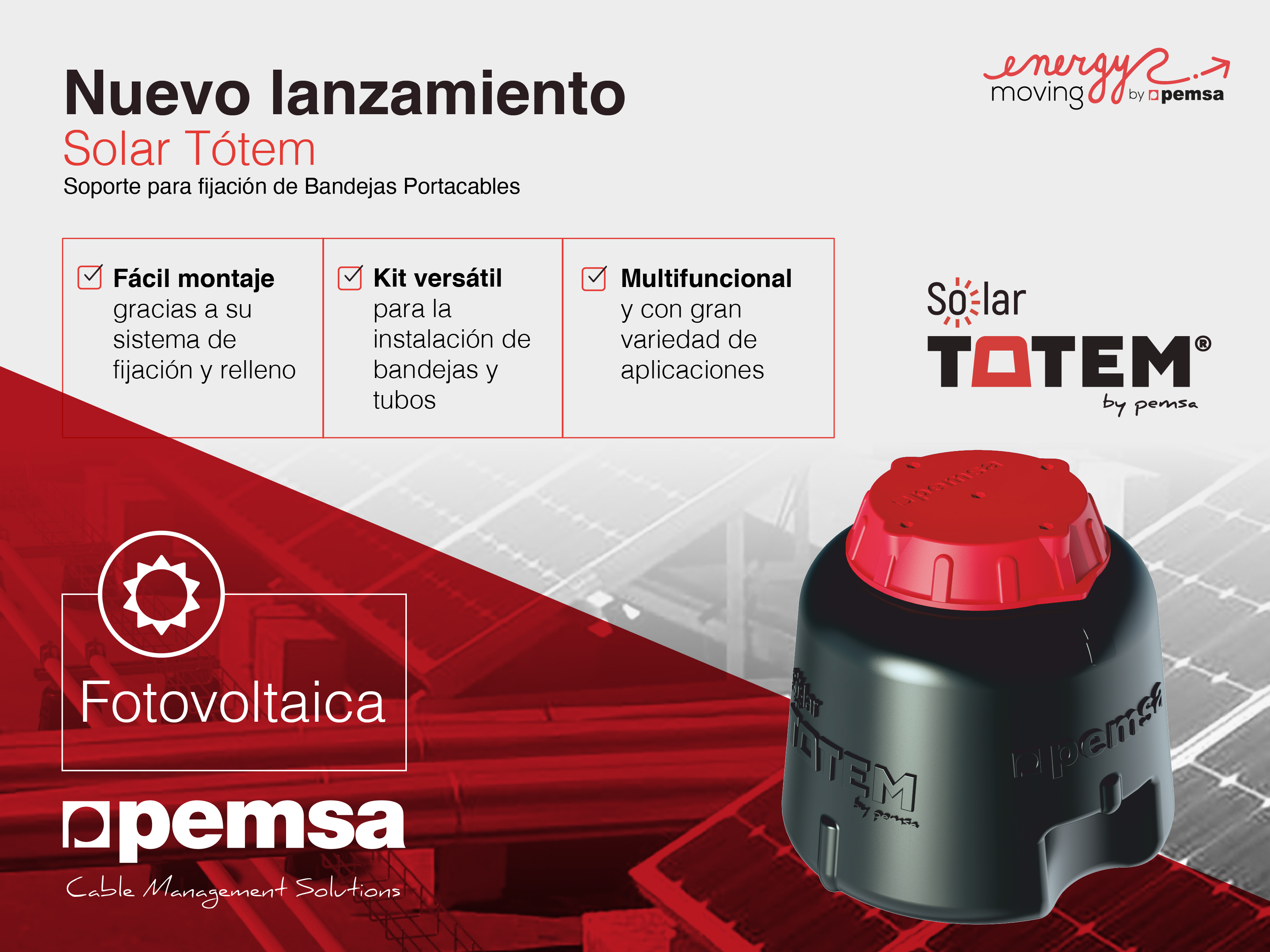 Este nuevo producto se engloba en la Solución de producto que dispone Pemsa enfocada a la industria fotovoltaica, autoconsumo y renovables. En ella se engloban el Sistema de Alta Resistencia BLACK C8, formado por la bandeja Rejiband Rapide Black BK8, Soportes y accesorios, así como varias gamas de tubos rígidos y flexibles con excelentes prestaciones para el sector de las energías renovables.