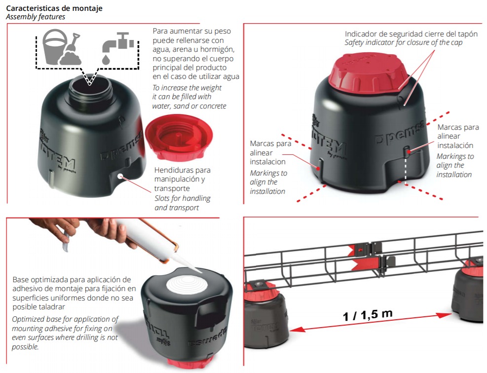 Solar Totem está diseñado de forma que pueda rellenarse con agua, arena u hormigón para aumentar su peso y facilitar la estabilidad del montaje, no superando el nivel del cuerpo principal del producto en el caso de utilizar agua.