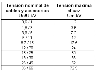 La norma UNE 20435 nos define los valores nominales en corriente alterna (no se recogen valores de continua) asignados a cables a partir de 1 kV:
