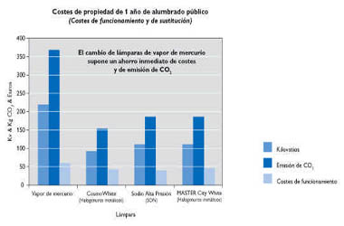 Se calcula que en Europa hay todavía, aproximadamente, unos 35 millones de lámparas de vapor de mercurio. Las cifras demuestran que, si todas estas lámparas así como sus equipos fueran reemplazados por la tecnología más moderna de alumbrado, los ayuntamientos europeos ahorrarían anualmente entre 600 y 700 millones de euros en los costes de operación. Además, Europa podría reducir sus emisiones de dióxido de carbono (CO2) en 3,5 millones de toneladas al año, lo cual sería un enorme avance en los objetivos fijados en Kyoto.