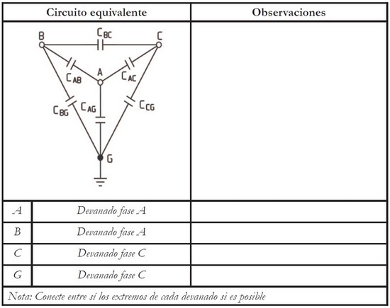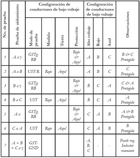 La tabla muestra un ejemplo de las conexiones entre el equipo de medida (en este caso un analizador de aislamiento de alta tensión DELTA4000 de Megger) y un devanado típico de un estator trifásico de generador. La tabla también muestra la serie de mediciones que se hacen de forma rutinaria en los devanados, mientras que el diagrama muestra el circuito equivalente para las pruebas. Observe que se considera que las conexiones entre las fases del devanado, y entre las fases del devanado y el neutro, están abiertas. Las mediciones de fase a tierra se hacen con el método de prueba GST-GND (GST a tierra), mientras que las mediciones de fase a fase se realizan con el método de prueba UST.