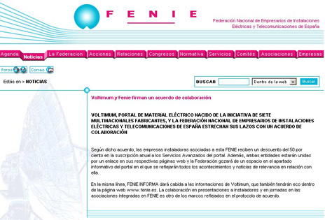 Con este acuerdo Voltimum y FENIE pasan a estar unidas por un enlace en sus respectivas páginas web. Todos los acontecimientos y noticias de relevancia en relación con la Federación quedarán reflejados en la sección informativa de www.voltimum.es. En la misma línea, la publicación FENIE INFORMA dará cabida a las informaciones de Voltimum, que también tendrán eco dentro de la página web www.fenie.es. La colaboración en presentaciones a instaladores y en jornadas en las asociaciones integradas en FENIE es otro de los marcos reflejados en el protocolo de acuerdo. Ambas entidades han llegado a un acuerdo de colaboración por el que las empresas instaladoras asociadas a esta última reciben un descuento del 50 por ciento en la suscripción anual a los Servicios Avanzados del portal. |