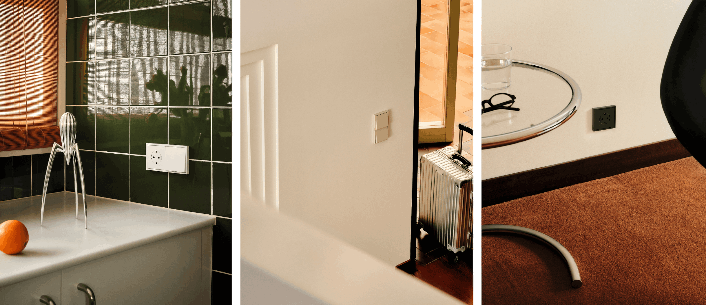 La colección se presenta en acabados mate, blanco, arena y negro, con un tacto suave que evita reflejos y reduce la aparición de manchas. Recupera la urea como material principal por su alta resistencia, integrando el color intrínsecamente en el propio material para garantizar una mayor durabilidad. Además, mantiene una simetría milimétrica con espacios mínimos e iguales entre tecla y marco, logrando una apariencia compacta y coherente en el conjunto.